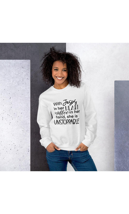 With Jesus in her Heart & Coffee in her Hand She is Unstoppable Sweatshirt