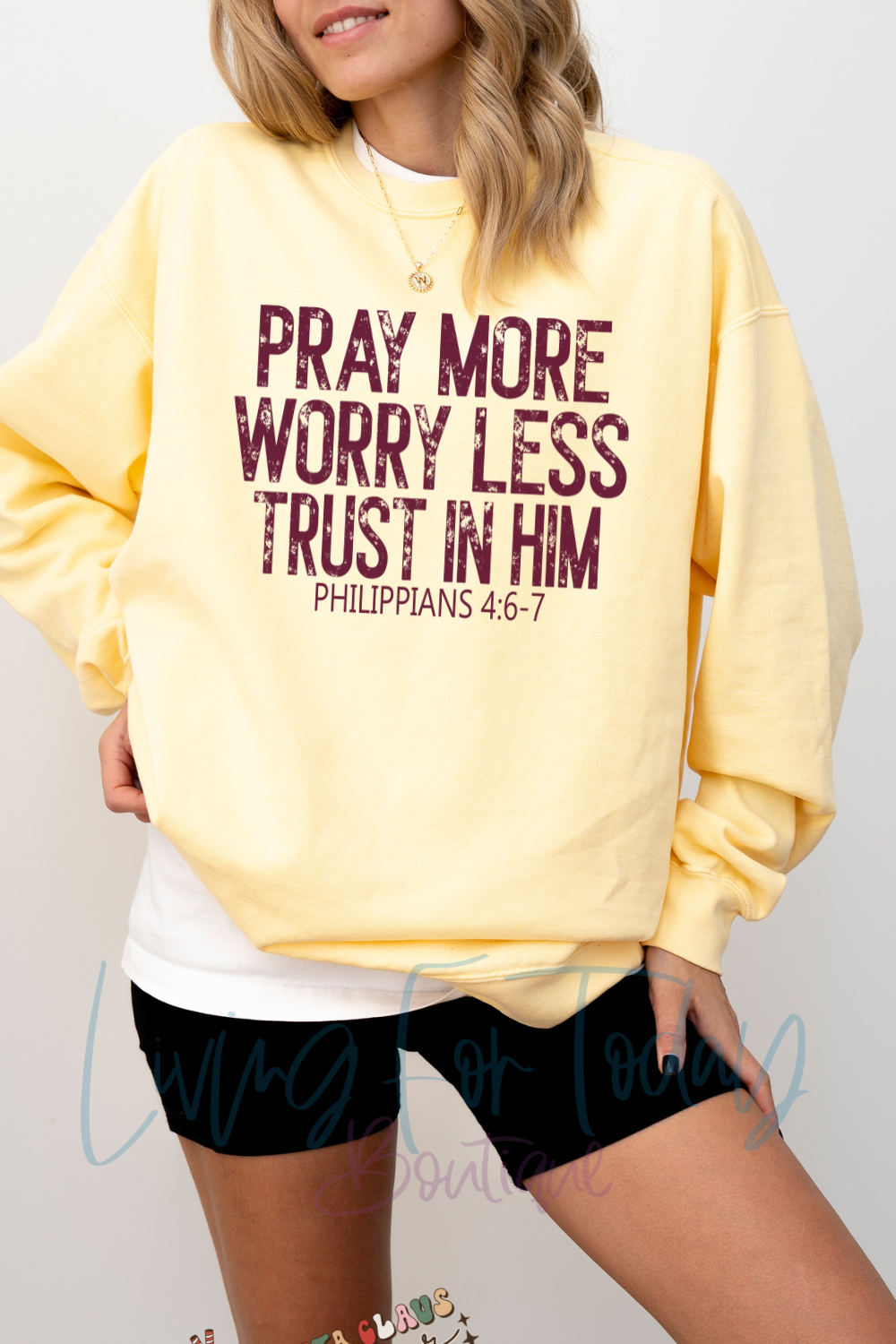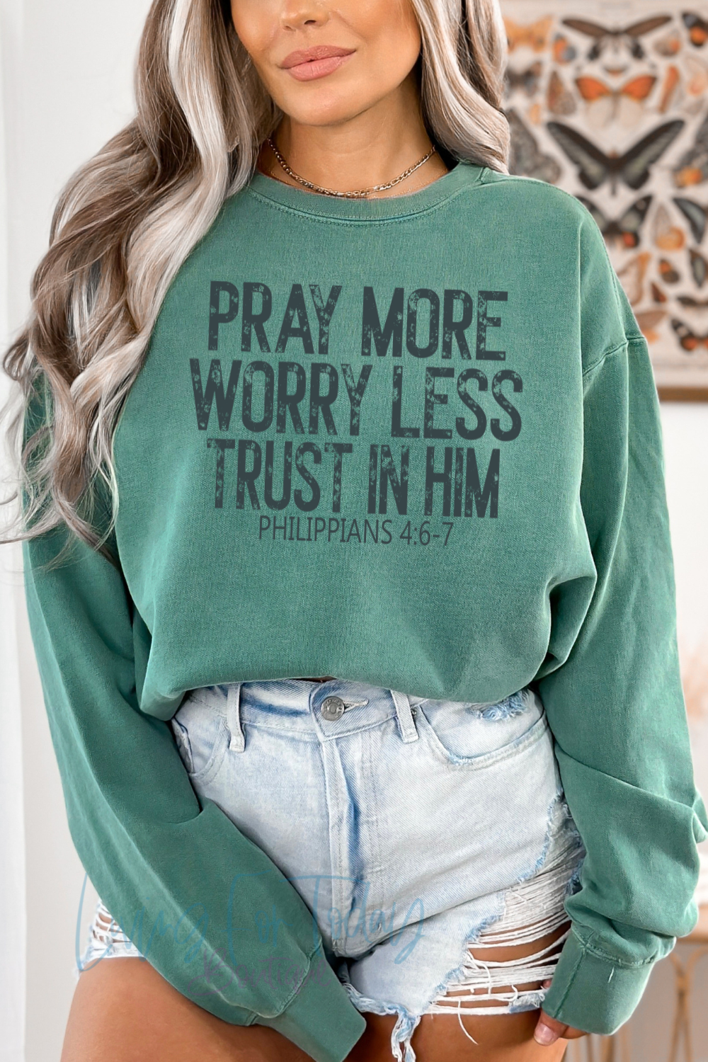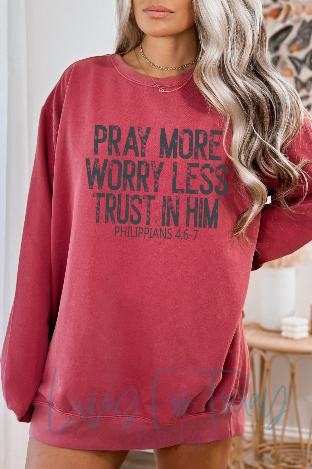 This Comfort Color sweatshirt features "Pray More Worry Less" with the verse reference "Philippians 4". Stay cozy and stylish while spreading a positive message and reminding yourself to maintain a peaceful mindset. Perfect for those who value both comfort and faith.