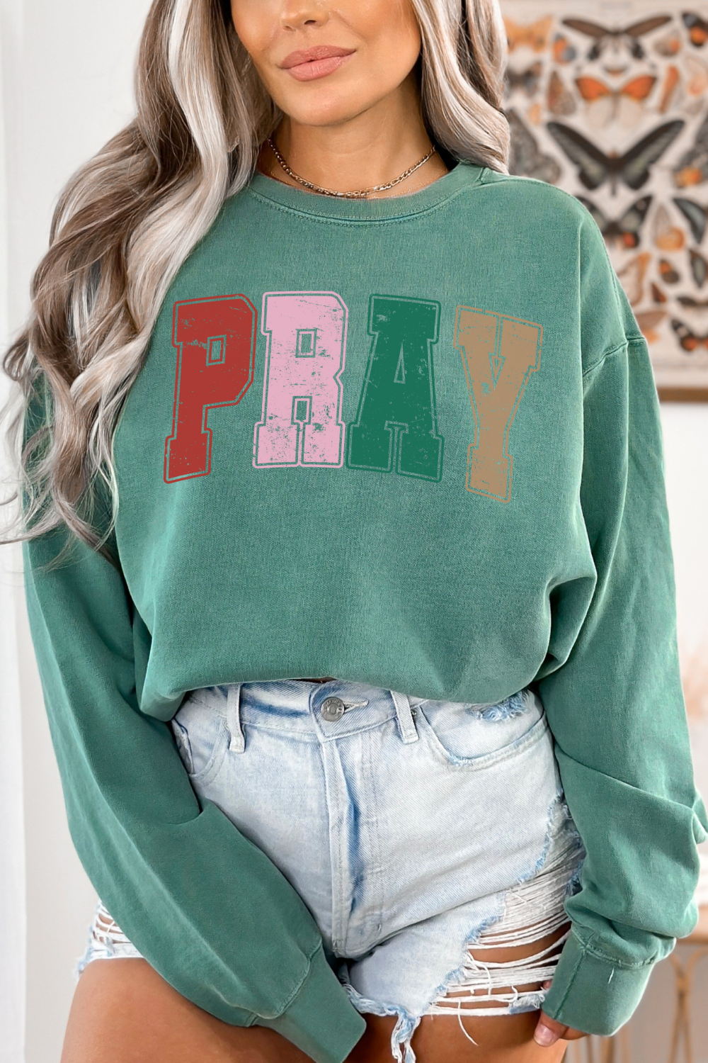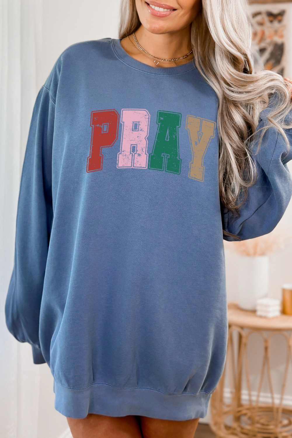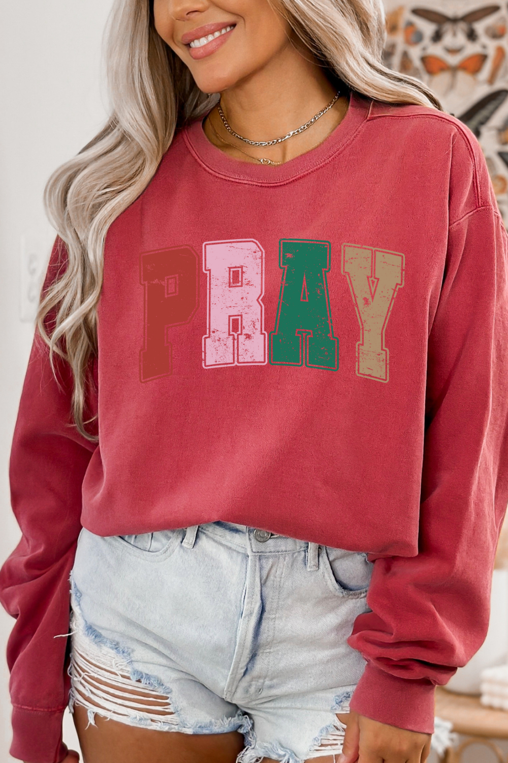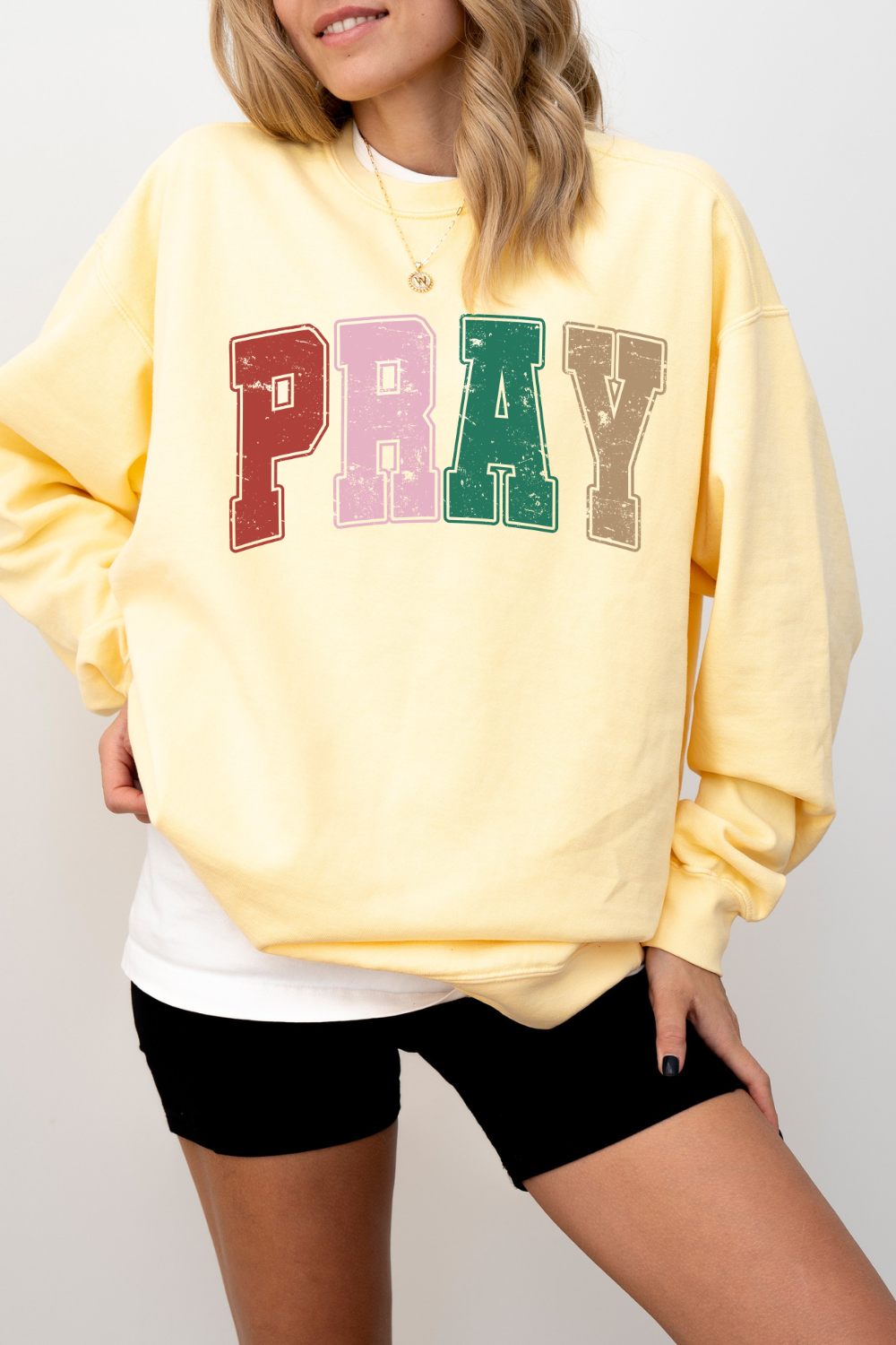 Stay warm and stylish with the Comfort Colors Varsity Pray Sweatshirt. The distressed varsity design adds a unique touch, while the word "pray" serves as a reminder to always have faith. Perfect for cozy days or casual outings.