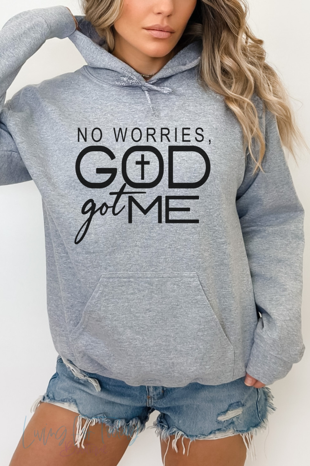 The No Worries God Got Me Hoodie is the epitome of chill. Its blend of cotton and polyester creates a comfy, cozy feel that's perfect for a chilly day. The front features a spacious kangaroo pocket for daily convenience, and the hood's drawstring matches the sweater for a stylish touch.